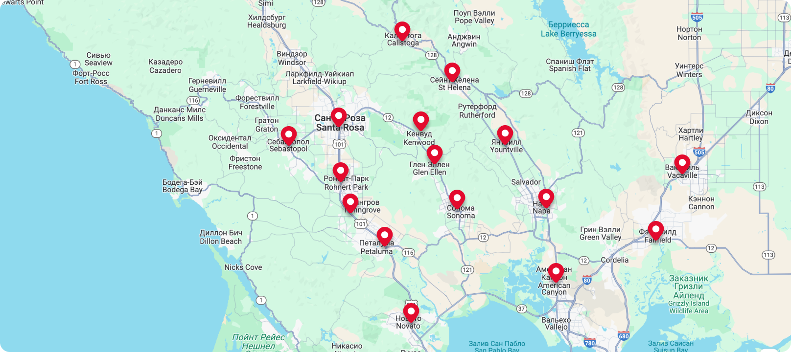 in Sonoma County: Santa Rosa, Glen Ellen, Sonoma, Rohnert Park, Cotati, Petaluma, Penngrove and Novato.